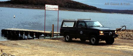 Courtesy Dock Program, Ramps, & Access Norfork Courtesy Dock Program: In 1992, a courtesy dock built by the Sportsman's Club of Mountain Home was installed at Cranfield Rec. Area as an experiment. The dock was well received by the public. As a result, two additional docks were installed in 1994 (Quarry and Henderson Recreation Areas). Four more (at Panther Bay, Jordan, Gamaliel, and Red Bank Recreation Areas) were installed this year. Signs were erected on the existing courtesy docks explaining their purpose and to eliminate unintended uses (e.g. swimming). Routine maintenance such as repairing loose boards and replacing missing tires was performed on the docks. This is a popular program. Bull Shoals Courtesy Dock Program: An experimental courtesy dock, built by the Sportsmen's Club of Mountain Home, was installed at Oakland Rec. Area in 1992. Three more courtesy docks were installed in 1994 (at Lakeview Rec. Area, Fairview AA, and Welcome Ridge AA). Three more have been constructed and installed this year at Bull Shoals Access Area, Buck Creek Rec. Area, and Lead Hill Rec. Area. The docks receive much use and favorable public response. At least 2 more will be installed in 1996. Because of ramp slope problems at Bull Shoals AA, a modified ramp will be developed and installed The courtesy docks are currently funded 50/50 by the Sportsman's Club and AG&FC. Boat Ramps: Statewide, the Arkansas Game and Fish Commission has constructed over 210 boating access areas. Generally these free boat launching facilities have a double wide concrete ramp and about an acre of paved or graveled parking. Some areas contain significant river frontage for bank fishing as well. The Mountain Home area is well served by this program. The AG&FC has constructed four boating access areas on Bull Shoals (Bull Shoals, Fairview, CCC, and Welcome Ridge), one on Norfork Lake (Clamity Beach) and sixteen on the White containing 20 ramps. Other waters served by AG&FC boat ramps are the Spring River (2 sites), Crooked Creek, and the South Fork of the Spring. Several other boating access areas are planned for the future. Walk-in Access Areas: The AG&FC has also obtained several sites along our rivers which serve as walk-in access areas. Bayou and Lasseters Accesses on the Spring are extremely popular with wade fishermen. We recently received, through a generous donation by the Kelly family, land for a future access area at "The Slab", one of the most popular spots on Crooked Creek. Our largest walk-in area is at Cotter Springs where a railroad flat car serves as a bridge across the big spring and opens about 1/2 mile of excellent wade and bank fishing on the White. Our walk-in area at River Ridge on the North Fork River includes a wheelchair accessible fishing pier. The AG&FC built another wheelchair accessible pier at Mirror Lake at Blanchard Springs Recreation Area operated by the U.S. Forest Service. Several more walk-in areas are planned for future purchase and one additional fishing pier (Crown Lake at Horseshoe Bend) is approved for construction soon. Wheelchair Access On Norfork Lake go to the Cranfield campground area, on Bull Shoals Lake, go to Bull Shoals Lake Boat Dock. For the North Fork River, go to River Ridge access area, and great wheelchair access is also available at Dry Run Creek just below the Norfork Lake dam area.