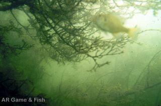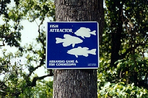 Man-made fish cover in Bull Shoals Lake results from the largest freshwater fish cover project ever completed. In 1989, Arkansas Game and Fish Commission initiated a large-scale fish habitat enhancement project with the help of many local interests including area businesses, sportsmans clubs, and individuals. The project involved the sinking of some 60,000 trees to create fish attractors at 400 sites on Bull Shoals Lake. The trees were cut from the shoreline, following Corps of Engineers guidelines, then sunk in bundles consisting of 1 to 5 trees (depending on tree size) with concrete anchors. The trees averaged 4 to 5 inches in diameter and ranged in size from 2 to 18 inches in diameter. Hardwoods were preferred but many cedars were also used. The bundles were dropped at a depth of 20 to 25 feet deep (630 to 635 feet above mean sea level) along a contour line roughly parallel to the shoreline. A reflective blue and white sign was attached to a tree on the shoreline to mark the location of a bundle of trees about in the center of the attractor (see photo of sign). Anglers or SCUBA divers can use these signs and sonar to locate the line of bundles. The development stage of the Bull Shoals Lake fish cover project was completed in 1992. Since that time, new cover has been added to the sites on a rotational basis to maintain their attractiveness to fish. The project has improved angler catch rates on Bull Shoals Lake. Underwater observations have shown that the cover effectively attracts fish, especially black bass, crappie, bluegill, walleye, and catfish. |