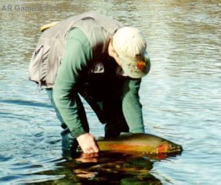 Catch and Release Trout Areas Although wild brown trout in Arkansas tailwaters currently reach world record proportions, the once spectacular size of rainbow trout in the 1950s and 60s has declined over the past 30 to 40 years. In an attempt to provide an opportunity to catch rainbow trout of at least four pounds, five tailwater catch and release areas totaling 5.5 miles were selected based upon studies in 1992-93 which indicated that although rainbow growth rates remained close to historical levels, angler harvest was rapid. These areas were implemented January 1, 1995. Rainbow trout populations in the catch and release and surrounding standard regulation areas were monitored through pre and post-regulation Peterson mark and recapture electrofishing samples. Angler use and success were determined for two areas on the Bull Shoals Tailwater through an angler creel survey. Based upon spring and winter 1996 samples there were 26 to 85 times more rainbow trout of at least 16 inches in four of the five areas with catch and release regulations versus standard regulation waters or to the baseline condition. In portions of the tailwaters with the standard regulations of 6 fish/day and no rainbow size limit, virtually no rainbow 16 inches or larger were captured. Catch and release areas yielded estimates of up to 1,187 and 266 rainbow/mile of at least 16 and 20 inches respectively. Population samples in the Greers Ferry Tailwater catch and release area have yet to show that the regulation is working. Possible explanations include poor sampling efficiency due to depth and relatively lower fishing pressure on the surrounding standard regulation waters. The Bull Shoals Tailwater creel survey revealed that from April 1995 to March 1996 anglers fishing in catch and release areas had 2 to 3 times better rainbow catch rates than in the tailwater as a whole. Catch and release anglers also caught 6 to 24 times more 16- 18 inch rainbow trout. Annually there were 8-68 times more 16- 18 inch rainbow trout/mile caught in the catch and release areas. In the Bull Shoals Dam catch and release area it was estimated that there were 10,032, 16- 18 inch rainbow landings during an 11 month period of the creel. Although initially the Bull Shoals Tailwater catch and release areas received relatively IOW fishing pressure, it appears that pressure has increased since March 1996. Based upon the information determined in the two year evaluation period, management recommendations will likely include additional catch and release areas or the expansion of current areas. Additionally, areas chosen will need to be suitable for effective sampling and in portions of tailwaters with at least moderate fishing pressure.