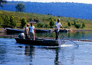 Cove-rotenone This technique is most commonly used to sample fish populations in reservoirs. Because one of the main purposes of cove-rotenone sampling is to evaluate reproductive success of sportfish and their forage, it is usually conducted in late summer. A cove is selected, then blocked ff by a net that extends from surface to bottom. This keeps fish from entering or leaving the sample area. Rotenone, a fish toxicant, is introduced into the cove at a rate suffcient to kill only the fish in the sample area. Rotenone interferes with the way fish breath. They are dipped up when they surface or when they drift up after dying. The pick-up lasts two days to make sure all the fish are recovered. The fish are then sorted out by species, sized,and weighed. By this method, we obtain the widest range of data about cove fish populatiuons in the reservoir. In our area, we conduct rotenone samples on three coves on both Bull Shoals and Norfork Lakes. We do this annually and have 20 to 30 consective years of rotenone data. This database is used to evaluate the effects of fisheries management actions and environmental influences.