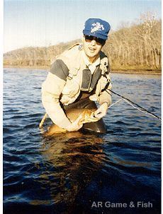 Cutthroat Trout Cutthroat were first introduced into the White River in the early 1980s. Fine-spotted or Snake River subspecies eggs were obtained from the State of Wyoming in exchange for Smallmouth bass fry. Actually the first attempt at stocking Cutthroats involved putting eggs in Whitlock-Vibert Boxes (instream egg-stocking devices) and placing those in stream beds. That attempt was unsuccessful because of protracted and extensive high flows from Bull Shoals dam and lethal sediment deposition in the boxes. Eventually hatchery-raised fingerlings were stocked into the river where they thrived. They were also found to switch from insects and crustaceans to a fish diet early in life. Within a few years a 9 pound 12 ounce Cutthroat (the current state record) was caught. The six-pounder shown here is not uncommon. Other strains including the Westslope, were tried with unsatisfactory results. Lately, weve gone back to the original. Cutthroats are highly cacheable on almost any trout bait or lure. For this reason, harvest rates are high on the species. There has been no evidence that Cutthroats have reproduced naturally. |