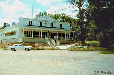 | - Until destroyed by fire in 1986, the old general store served as headquarters for the resort and hatchery. A new structure, designed to resemble the original as it appeared in the 1890s, was erected on the site. Once again visitors can dine in a world-class restaurant while watching ruby-throated hummingbirds at feeders outside the large windows overlooking the mill and Spring Creek. And a fresh trout dinner followed by blackberry or apple cobbler is the perfect complement for our tour of the old mills. Reservations Recommended. Rainbow Trout Ranch |